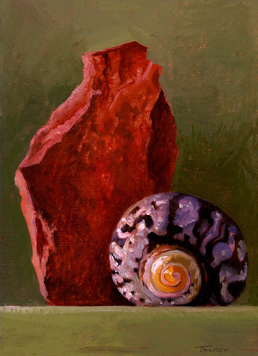 Found this wonderful Sedona red rock outside the studio one day, the same day I found this smooth, pearlescent African shell in a mystical mysterious Sedona-type shop. This original oil is 5 X 7", unframed, on archival linen board.