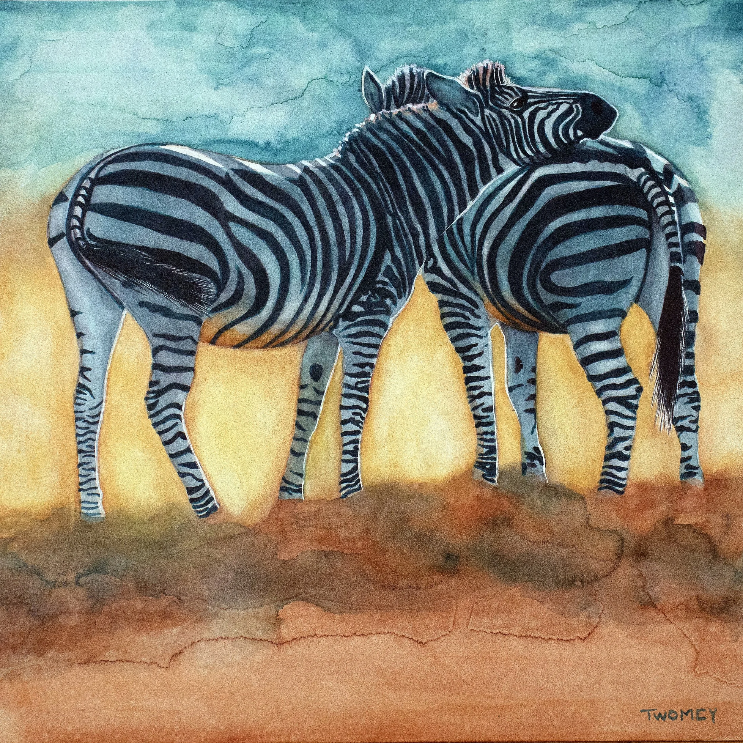 I am pleased to announce a new series of Pigments on Aquabord paintings, recently completed. This is just a preview image of two zebras I encountered in Kruger National Park at sunset. The prime viewing time for African animals is very early in the morning, or sunset. There was such a mystery to watching them end their day in companionship and light. This piece is 12 X 12” on 2” Aquabord and is varnished and ready to hang. It will be released soon.
